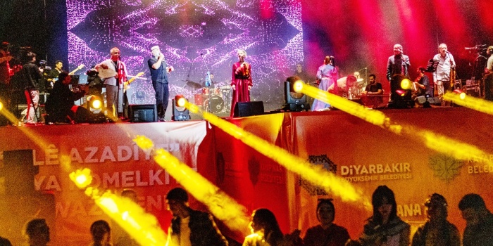 Konser alanına kurulan dev sahneye “Kulîlkên Azadiyê Pêşwaziya Aştiya Civakî Dikin (Özgürlük çiçekleri toplumsal barışı karşılıyor)” yazılı pankart asıldı.